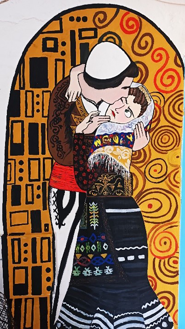 Pikërisht ,,Puthja” është kthyer në versionin shqiptar përkatësisht në versionin e veriut duke veshur veshjen kombëtare, nga artistja shkodrane Nermin Shurdha e njohur edhe ndryshe si ,, vajza që pikturon muralet e Shkodrës’’ ! Domosdo në qoftë se keni vizituar qytetin e Shkodrës keni hasur në një nga muralet e saj si në vendet publike ashtu edhe private, të tilla si : murali tek Gjimnazi ,, 28 nëntori’’, murali në Shirokë,etj, apo në qoftë se keni pirë kafe pranë lokaleve të tilla si: “Merci”, “Arka” etj. Me profesion ekonomiste, Nermin Shurdha dashurinë për pikturë e trashëgoi nga babai i saj. Prej disa vitesh ajo pikturon nëpër muret e qytetit të saj duke përcjellë botën e saj të brendshme . Madje edhe vet ndërtesën ose thënë më mirë muret në ndërtesën në të cilën ajo jeton gjatë kohës së karantinës e ka shndërruar në art, art i cili përveç se merr jetë plotë me lloj-lloj ngjyrash përcjell edhe mesazhe të shumta dhe emocione.